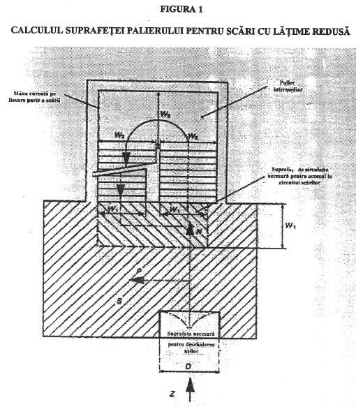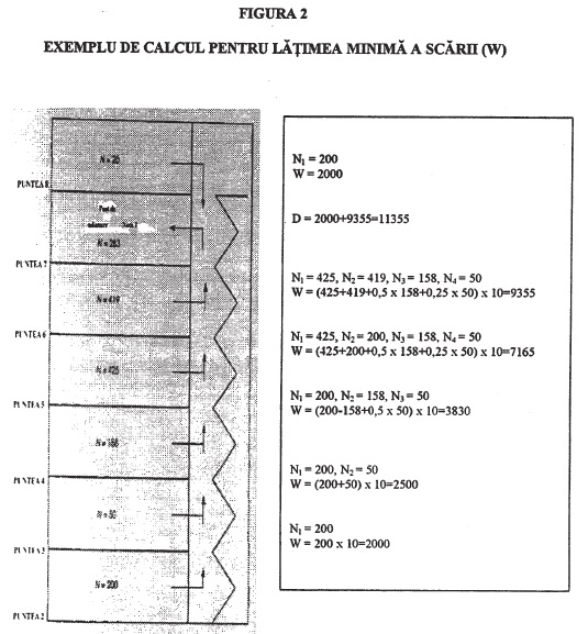 Z (pers) = numărul de persoane presupuse a fi evacuate pe scaraN (pers) = numărul de persoane care intra direct în circuitul scării pornind de la o punte dataW (mm) = [N(1) + N(2) + 0,5 x N(3) + 0,25 x N(4)) x 10 = lăţimea calculată a scăriiD (mm) = lăţimea uşilor de ieşire