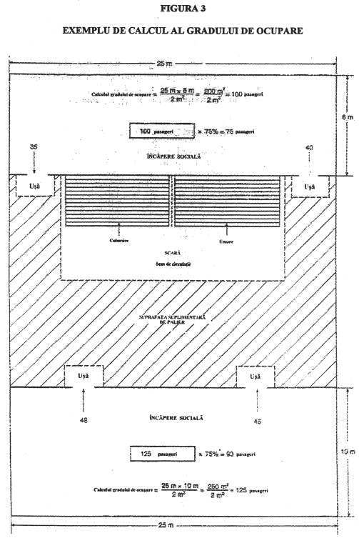 2.2.2.1 Pornirea motorului dieselOrice motor diesel care acţionează pompa trebuie să poată porni imediat în stare de motor rece, până la o temperatura de 0°C, cu ajutorul unei manivele. Dacă acest lucru nu este posibil în practica, sau dacă se înregistrează temperaturi mai scăzute, se va avea în vedere prevederea şi întreţinerea unei instalaţii de încălzire, considerată acceptabilă de către Administraţie, astfel încât să se asigure pornirea imediata. Dacă pornirea manuală nu e posibila în practica, Administraţia poate permite alte mijloace de pornire. Aceste mijloace trebuie să poată pune în funcţiune sursa de energie care acţionează motorul diesel cel puţin de şase ori într-o perioadă de 30 minute şi de cel puţin două ori în primele 10 minute.2.2.2.2 Capacitatea tancului de combustibilToate tancurile de combustibil trebuie să conţină suficient combustibil pentru a putea pune în funcţiune pompa în regim complet timp de cel puţin trei ore; de asemenea, trebuie să existe rezerve de combustibil disponibile în afară incaperii de maşini de categoria A pentru a putea pune în funcţiune pompa în regim complet timp de încă 15 ore.Capitolul 13 AMPLASAREA MIJLOACELOR DE EVACUARE1 AplicareAcest capitol conţine cerinţele aplicabile mijloacelor de evacuare, asa cum se prevede în capitolul II-2 din Convenţie.2 Nave de pasageri2.1 Lăţimea scarilor2.1.1 Cerinţe fundamentale cu privire la lăţimea scarilorScarile nu trebuie să aibă o latime mai mica de 900 mm. Lăţimea minima a scarilor trebuie marita cu câte 10 mm pentru fiecare persoana prevăzută peste numărul de 90 persoane. Numărul total al persoanelor evacuate pe aceste scări este presupus a fi format din două treimi din membrii echipajului şi numărul total al pasagerilor care se afla în spaţiile deservite de aceste scări. Lăţimea scarilor nu trebuie să fie mai mica decât cea determinata conform prevederilor paragrafului 2.1.2.2.1.2 Metoda utilizata pentru calculul latimii scarilor2.1.2.1 Principii de bază pentru calcul2.1.2.1.1 Aceasta metoda de calcul permite determinarea latimii minime a scarilor la nivelul fiecărei punti, ţinând seama de scarile consecutive ce duc la scara respectiva.2.1.2.1.2 Metoda de calcul trebuie să considere evacuarea din spaţiile închise situate în fiecare zona verticala principala şi sa ţină seama de toate persoanele care folosesc casa scării în fiecare zona, chiar dacă ele intra pe acea scara din alta zona verticala.2.1.2.1.3 Pentru fiecare zona verticala principala, calculul trebuie efectuat pentru timp de noapte (cazul 1) şi pentru timp de zi (cazul 2) şi cea mai mare dintre dimensiunile obţinute în cele doua cazuri trebuie utilizata pentru calculul latimii scarilor pentru fiecare punte luată în considerare.2.1.2.1.4 Calculul latimii scarilor trebuie să se bazeze pe numărul membrilor de echipaj şi de pasageri de pe fiecare punte. Numărul ocupantilor trebuie să fie calculat de către proiectant pentru încăperile de locuit ale pasagerilor şi membrilor de echipaj, încăperile de serviciu, încăperile de comanda şi încăperile de maşini. În acest sens, capacitatea maxima a unei încăperi publice trebuie să fie definită printr-una din următoarele doua valori: numărul de locuri pentru aşezare sau amenajări similare sau numărul obţinut prin atribuirea a 2 mp de suprafaţa bruta de punte fiecărei persoane.